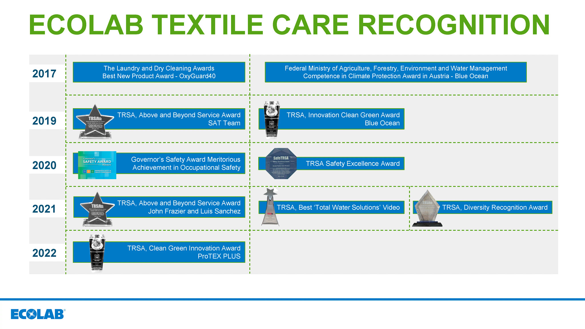In 2021, the Ecolab Textile Care Division and ProTEX Plus program won the Clean Green Innovation Award. This prize honors outstanding efforts to reduce environmental impact, and meet TRSA energy and water conservation standards.